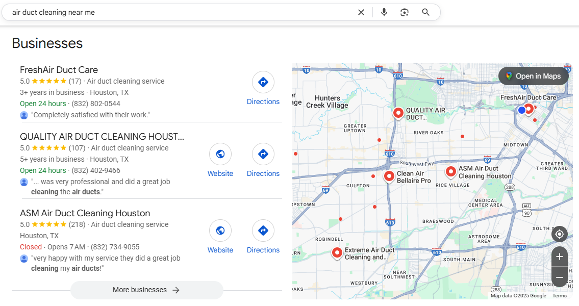 Appear in Houston map packs when customers search for air duct cleaning leads houston near them.