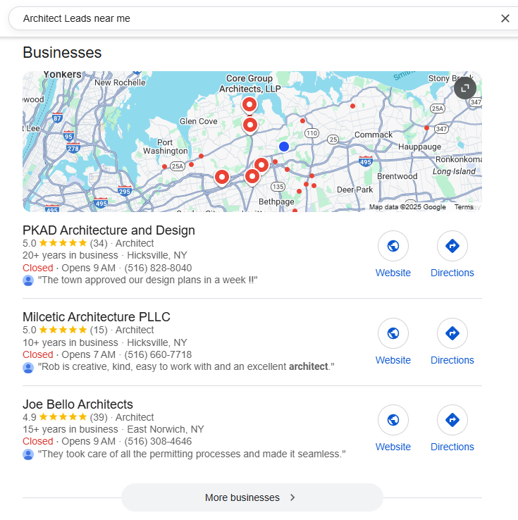 Show up in local map packs for high-converting searches like “architects [city]” and “building design near me.”
