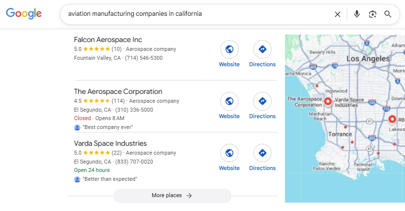 Show up in Google Maps and local searches for terms like “aircraft parts manufacturers [city]” or “aerospace machining.”