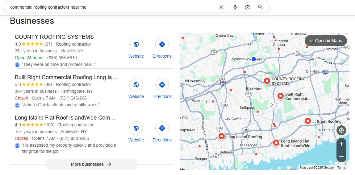 Show up in local map packs for searches like “industrial roofers [city]” and “commercial roof replacement near me.”