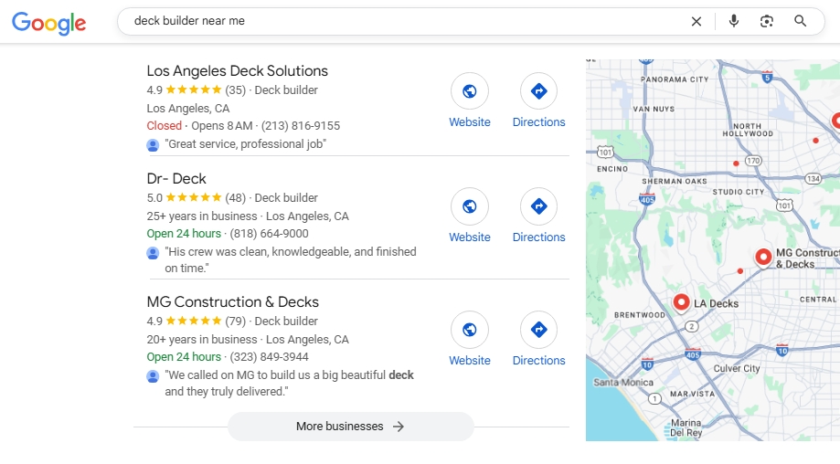 Get found for terms like "deck builder near me," "deck installation [city]," or "custom outdoor decks."