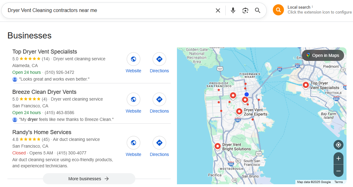 Appear in Google’s map pack for high-intent searches like “dryer vent cleaning [city]” or “air duct maintenance near me.”