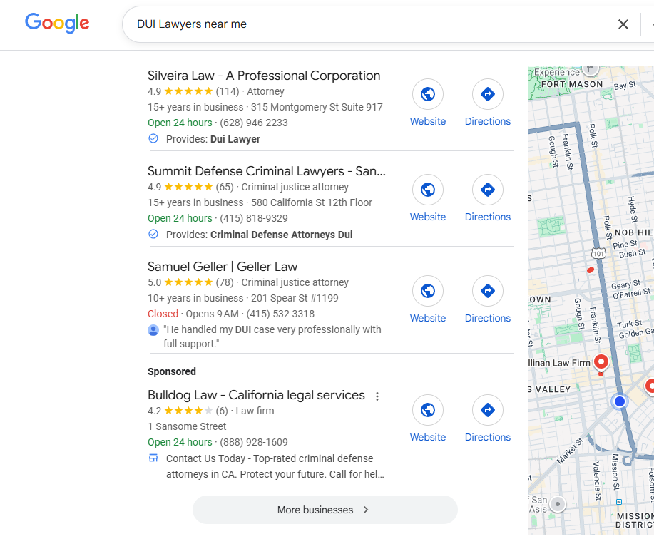 Show up in Google’s map pack for searches like “DUI attorney [city]” and “criminal defense lawyer near me.”