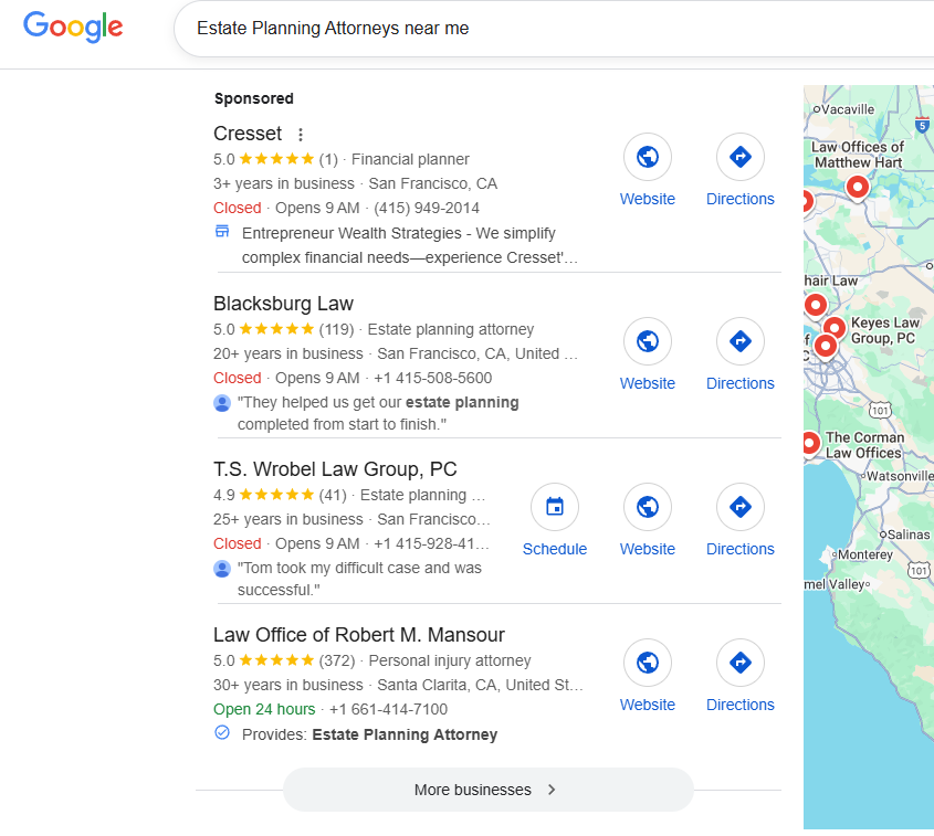 Appear in the map pack for searches like “estate planning lawyer [city]” and “trust attorney near me.”