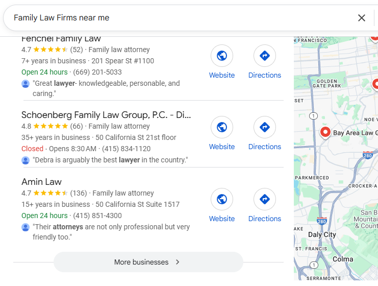Appear in Google’s map pack for valuable searches like “family law firm [city]” or “best divorce attorney near me.”