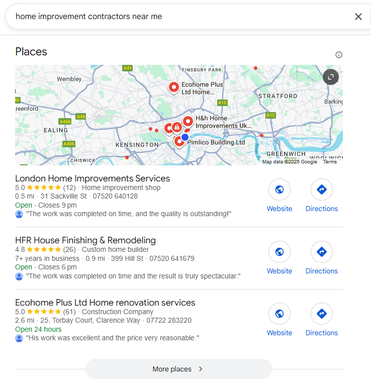 Rank for searches like “home improvement companies UK,” “bathroom renovation near me,” and “loft conversion specialists UK.”