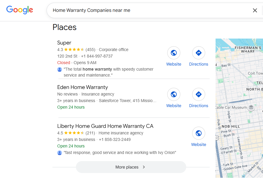 Show up in map packs and local results for key searches like “home warranty companies near me” or “home protection services [city].”