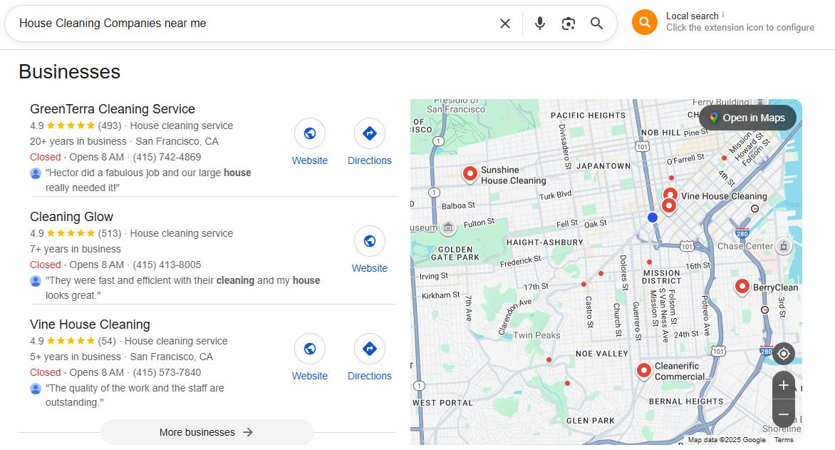 Show up in local map packs for searches like “maid service [city]” or “residential cleaning near me.”