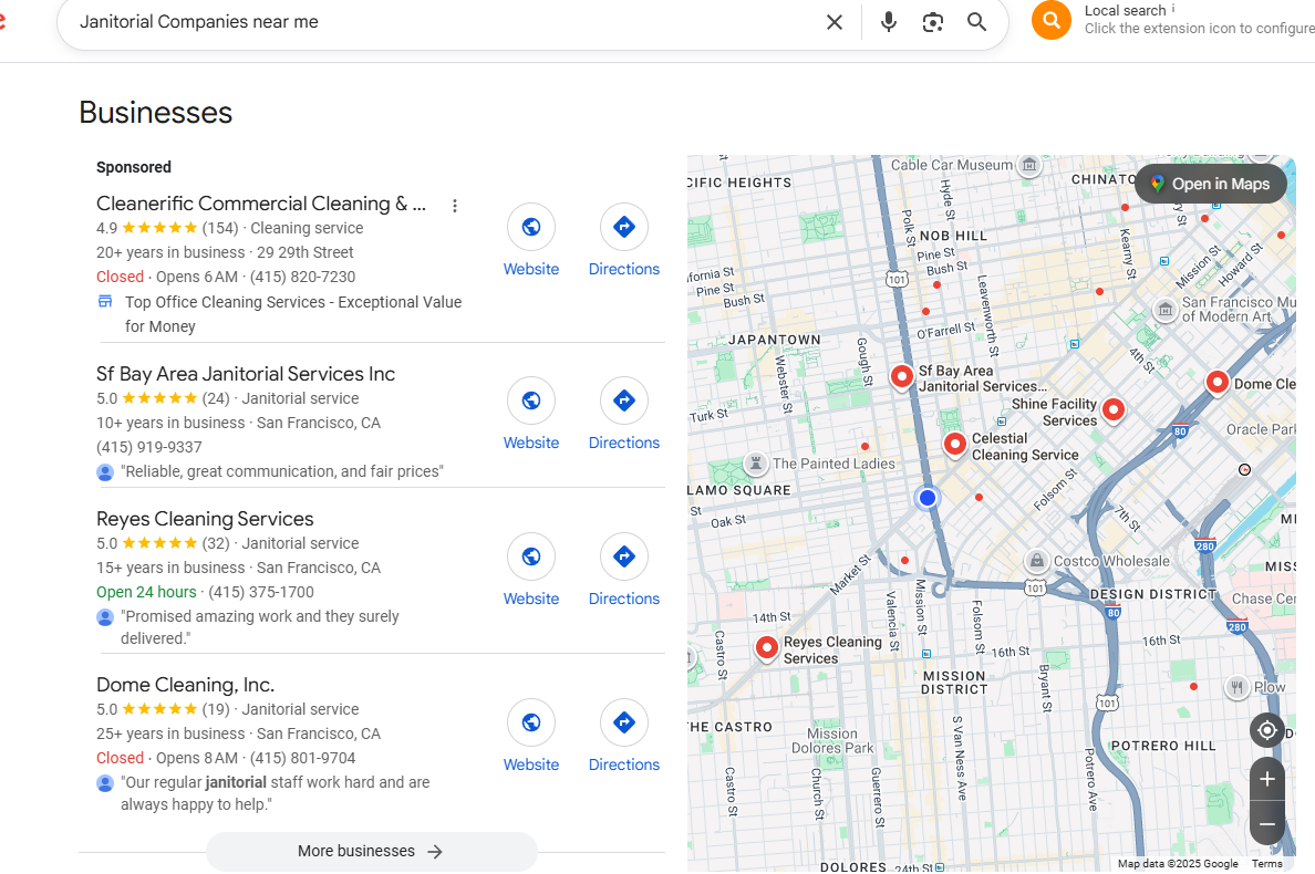 Show up in local map packs for searches like “janitorial cleaning [city]” or “office cleaning near me.”