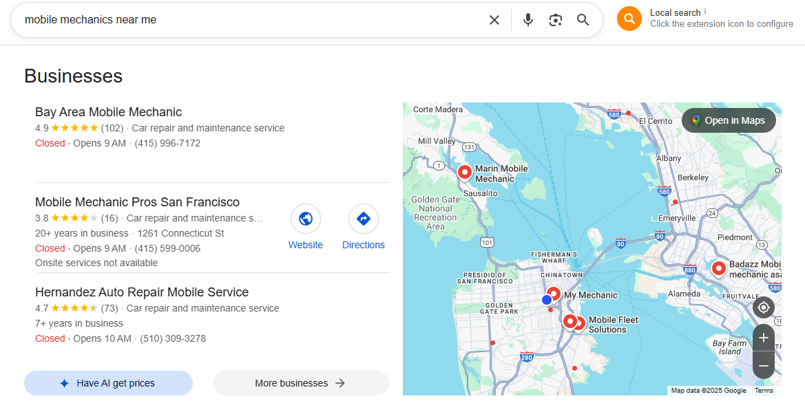 Show up in Google’s map pack for searches such as “24-hour mechanic [city]” and “on-site auto repair near me.”