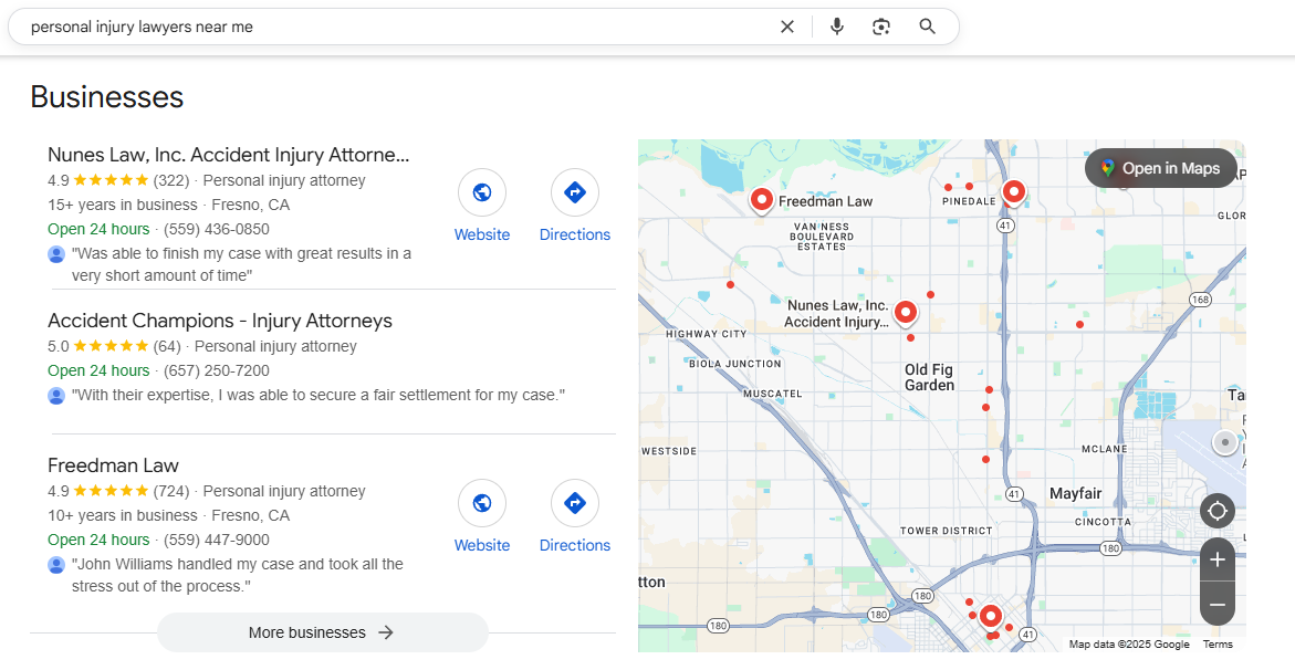 Appear in California’s most competitive markets — LA, San Diego, San Francisco, Sacramento — when people search for “injury attorney near me.”