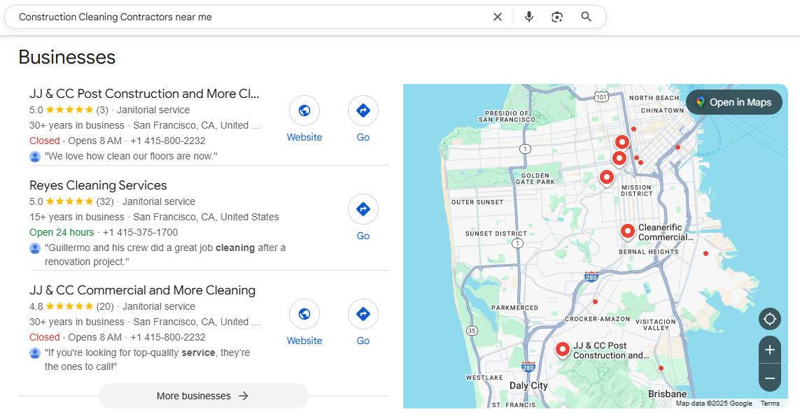Show up in local map packs for searches like “post-construction cleaning [city].”