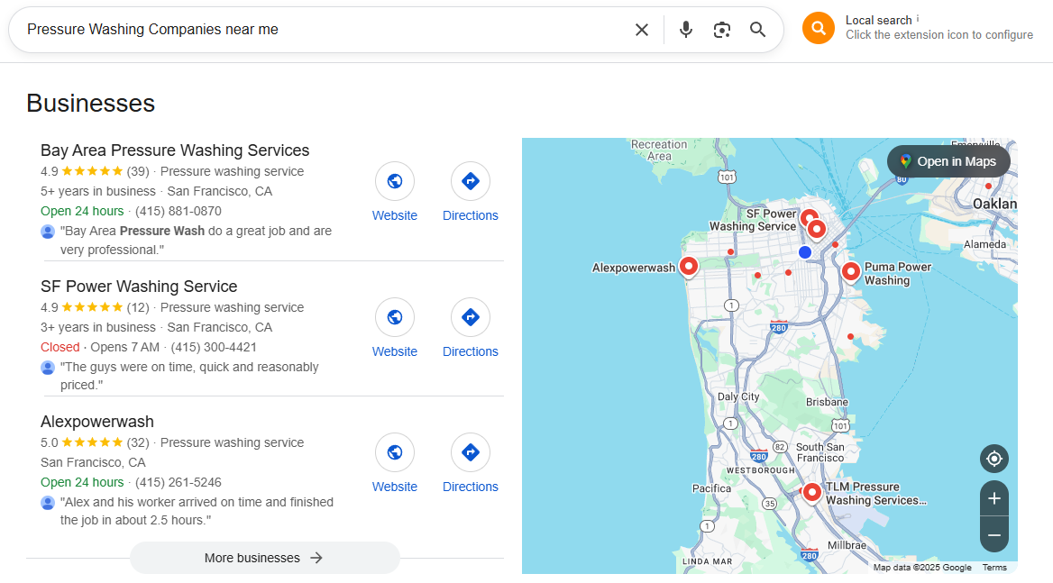 Pressure washing is a fast-turnaround, high-demand service that relies on visibility and timing. When homeowners notice dirt, stains, or buildup, they search for nearby professionals who can help immediately.