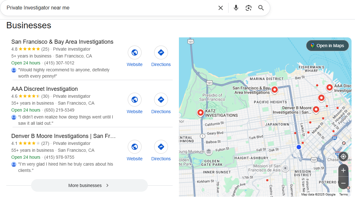 Appear in Google’s local map pack for searches like “licensed private investigator [city]” or “investigation services near me.”