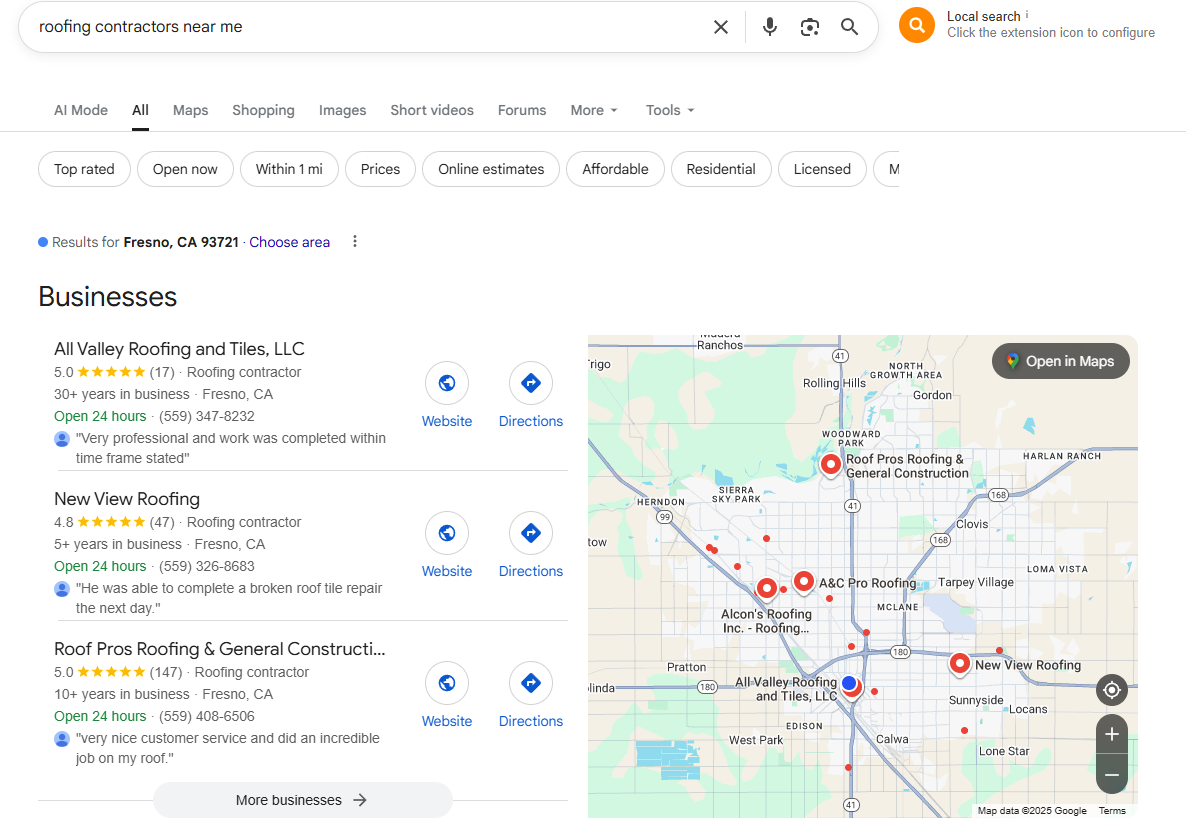Show up in Google’s map pack for high-intent local searches like “roof inspection Fresno” or “roof repair contractors near me.”