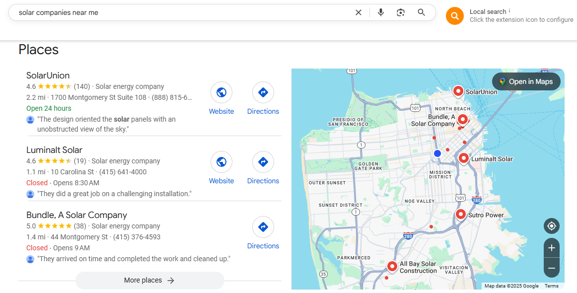 Appear in Google’s map pack for local, high-intent searches like “solar company [city]” and “solar installation near me.”