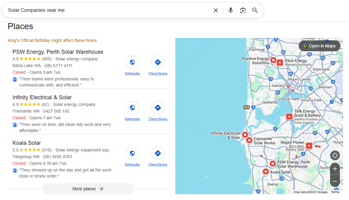Appear in Google’s map pack when Australians search for “solar companies near me” or “solar installation [city].”