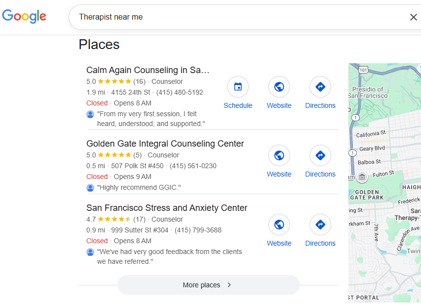 Show up in Google’s map pack for searches like “licensed therapist [city]” and “counselor near me.”